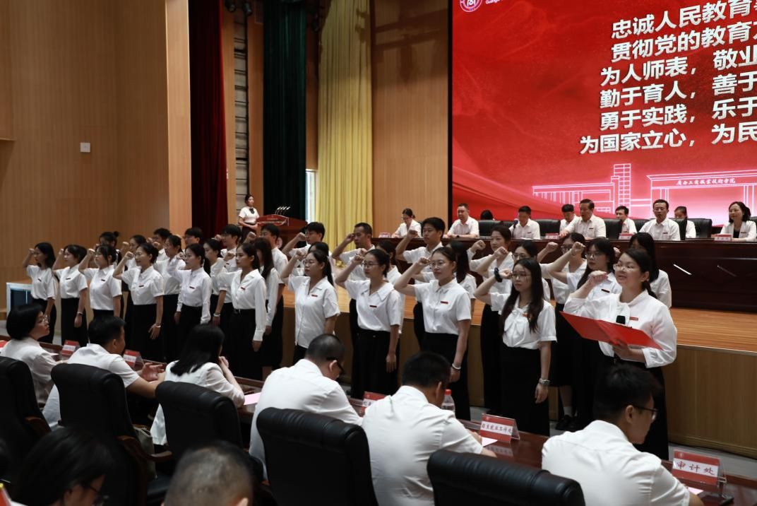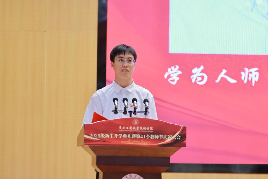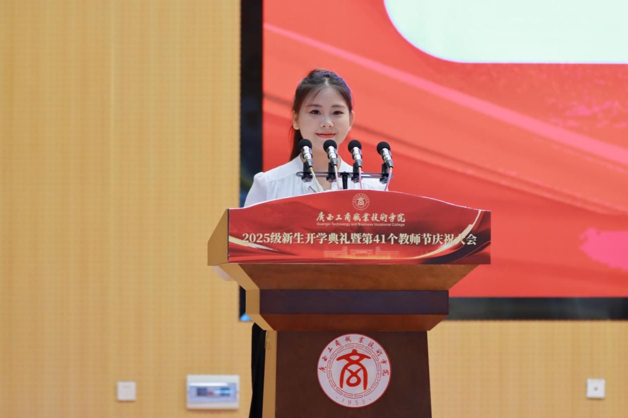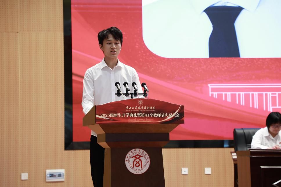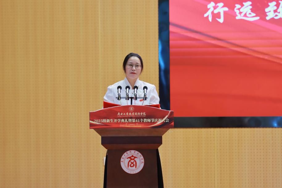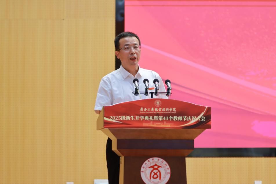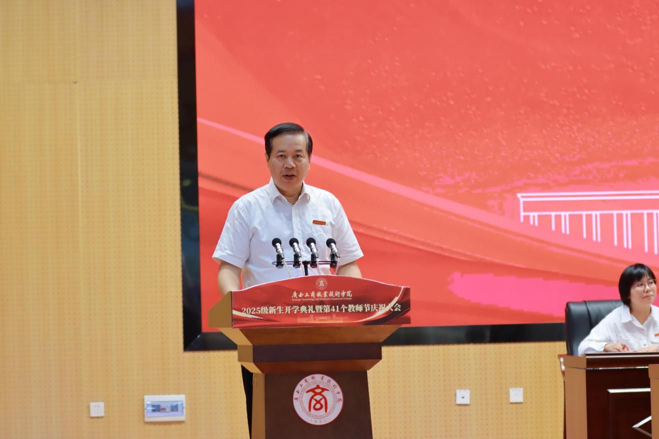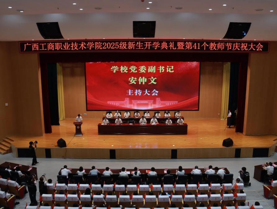 为热烈欢迎2025级新生入学,隆重庆祝第41个教师节,9月10日,学校以线上线下相结合的方式在武鸣校区、鹏飞校区、中尧校区同步举行2025级新生开学典礼暨第41个教师节庆祝大会。学校领导李维、刘进、安仲文、韦云凤、陈宁春、阙勇平、郑华,各部门、各单位主要负责人,受表彰教师代表,新入职教师代表,武鸣校区2025级辅导员代表和2025级新生代表在线下主会场参会,全体2025级新生及各部门、各单位教职工在线上参会。学校党委副书记安仲文主持大会。