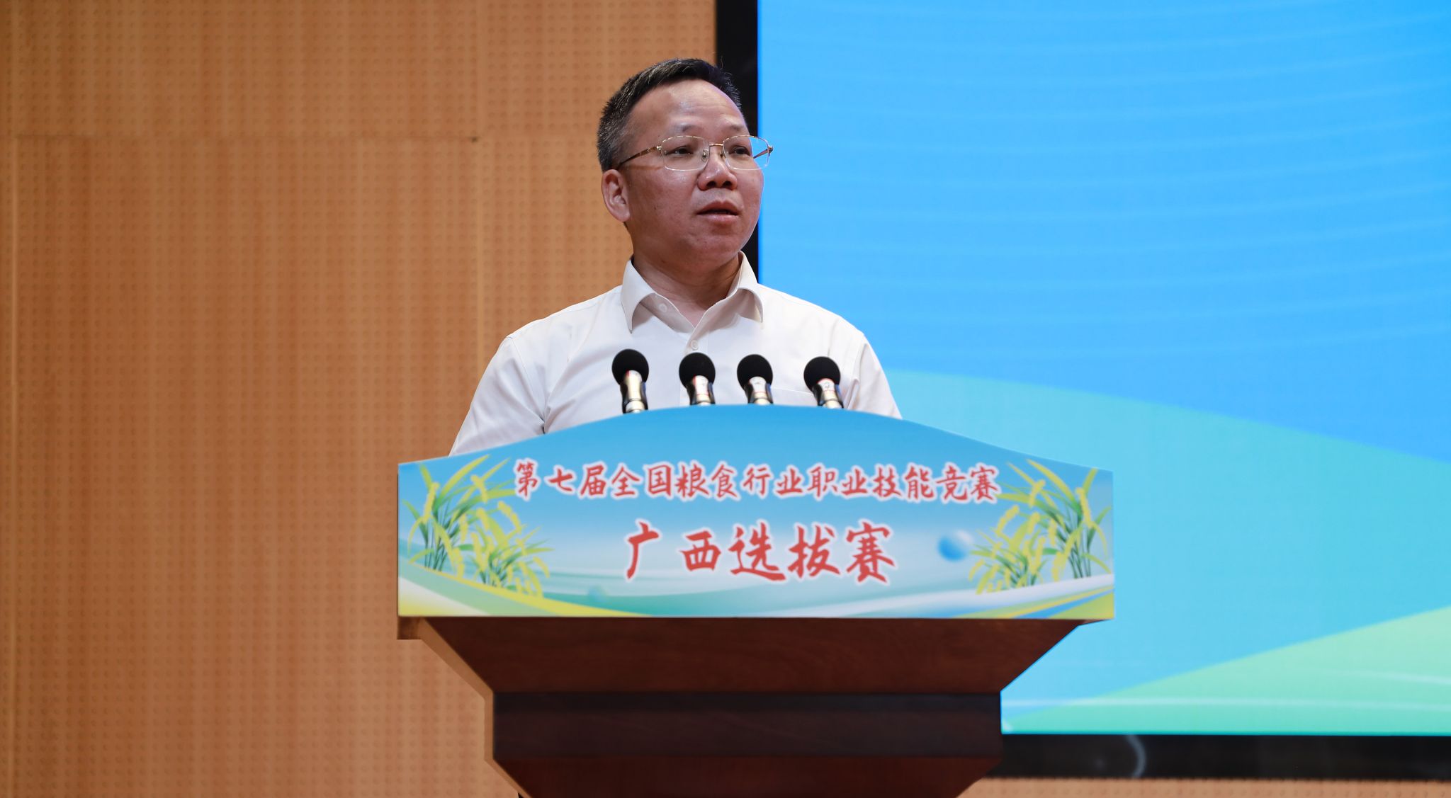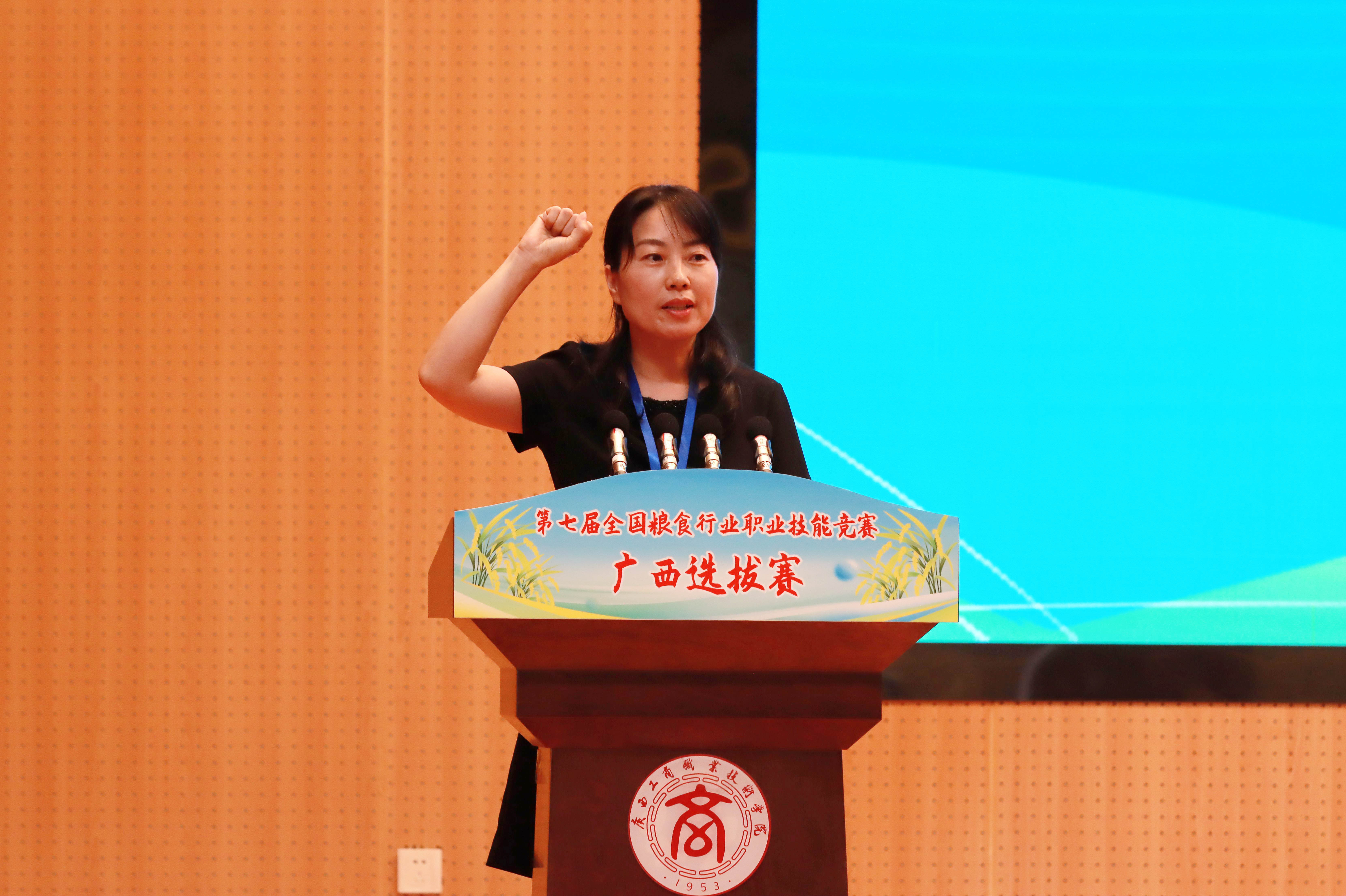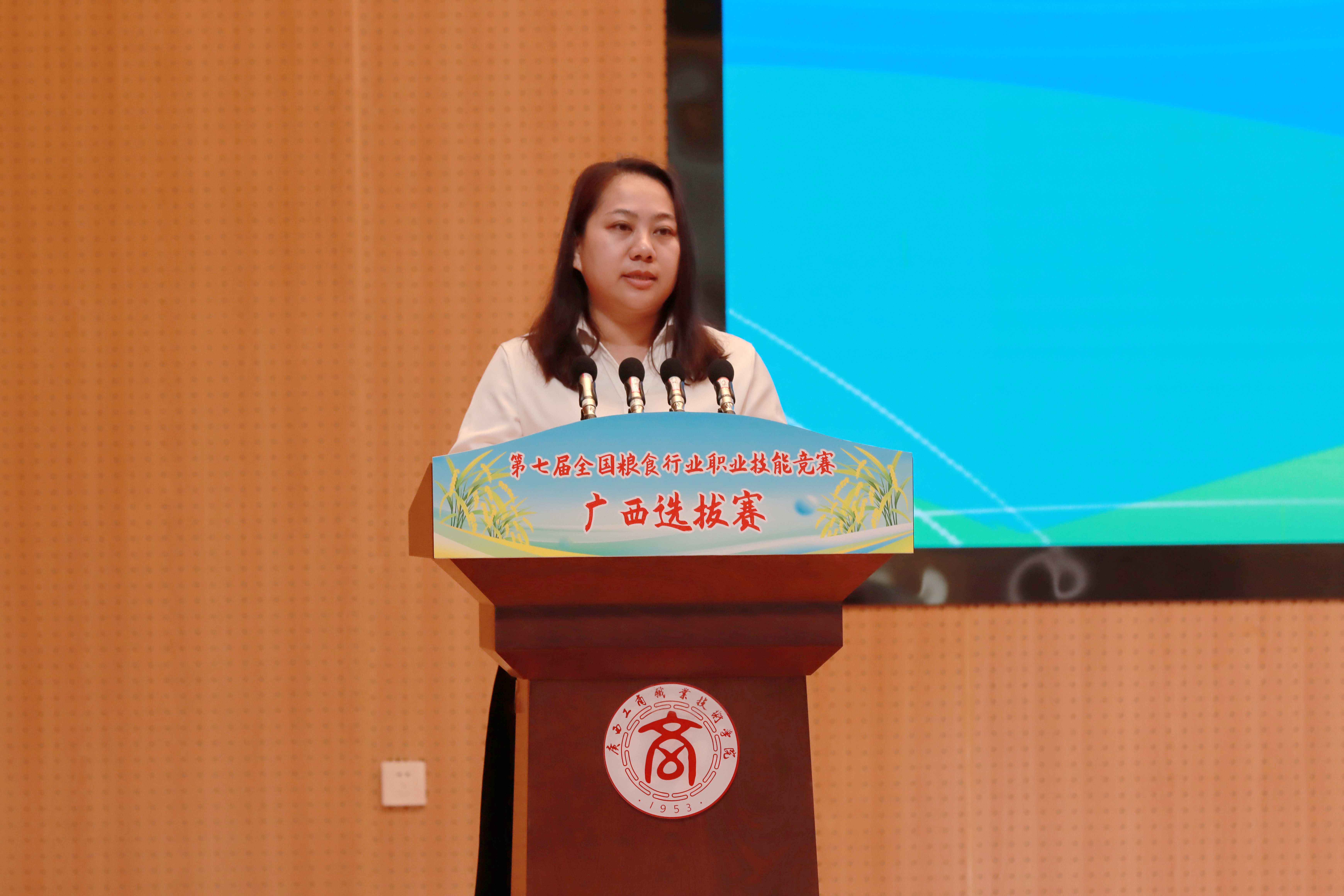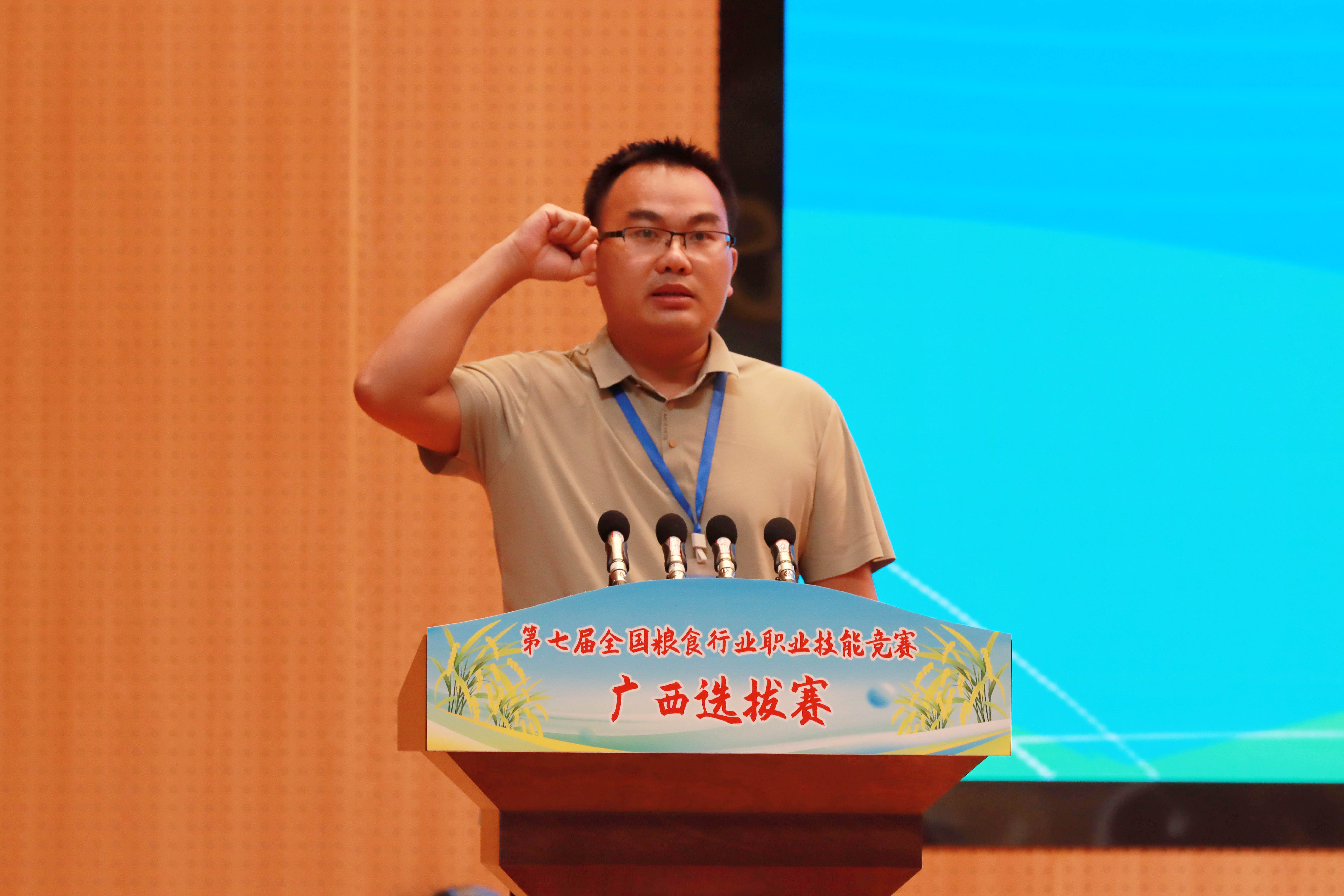 广西壮族自治区粮食和物资储备局党组成员、副局长覃家权在开幕式上讲话,他表示,粮食技能人才是保障国家粮食安全的重要支撑,是推动粮食产业高质量发展的关键力量。自治区粮食和物资储备局深入贯彻习近平总书记重要指示要求,以筑牢粮食安全屏障、全面推进广西粮食行业高质量发展为己任,大力实施“人才兴粮”、“科技兴粮”战略,在人才培养体系、人才队伍结构、人才创新能力、人才管理体制等方面取得显著成效。本次广西选拔赛既是为全国粮食行业职业技能竞赛遴选优秀选手的重要一环,更是激励全区粮食行业广大职工及相关专业的学生“学知识、练技能、强素质”的有效载体。希望全体参赛选手以饱满的热情、昂扬的斗志、精湛的技艺,全身心投入比赛,充分展示广西粮食人爱岗敬业、精益求精、追求卓越的精神风貌,达到“以赛促学、以赛促练、以赛促干”的目的。希望全区各级粮储部门以本次竞赛为契机,进一步加强技能人才队伍建设,加快建设一支知识型、技能型、创新型劳动者大军,为夯实广西粮食安全根基,守住管好“八桂粮仓”提供坚实的人才保障。