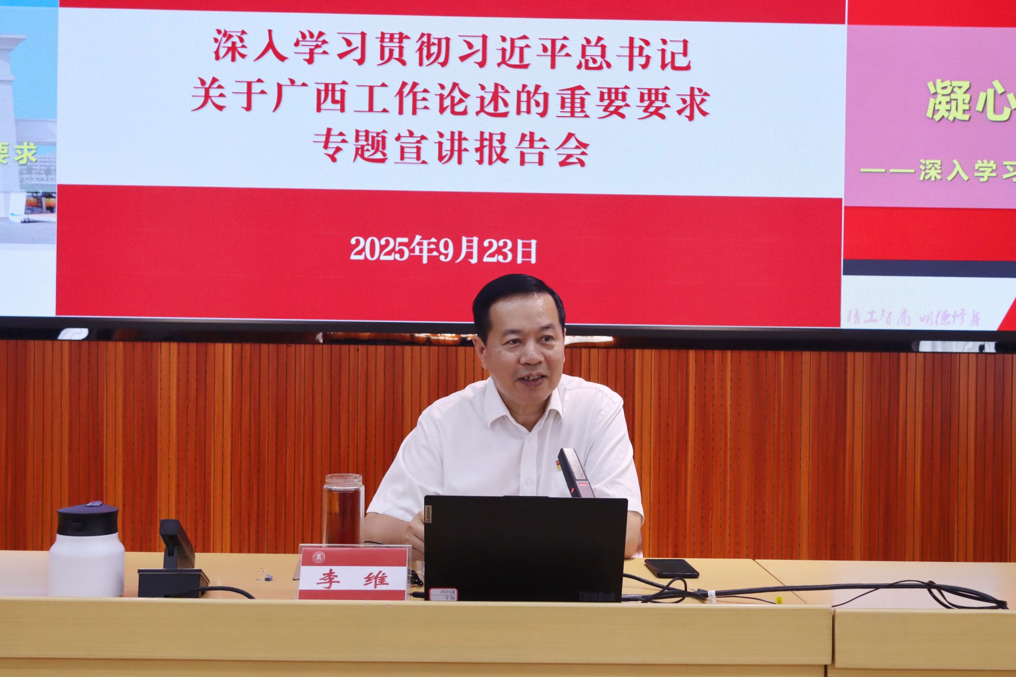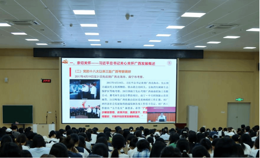 为深入学习贯彻习近平总书记关于广西工作论述的重要要求,铸牢中华民族共同体意识,推动党的创新理论有效触达青年群体,根据自治区党委宣传部《理论宣讲青年群体全覆盖三年行动计划工作方案》安排,9月23日,学校在鹏飞校区举办深入学习贯彻习近平总书记关于广西工作论述的重要要求专题宣讲报告会,学校党委书记李维作题为《凝心聚力建设新时代壮美广西——深入学习贯彻习近平总书记关于广西工作论述的重要要求》的专题宣讲报告。宣讲报告会采取线下讲授、线上直播结合的形式展开,全体在校生听取报告会。