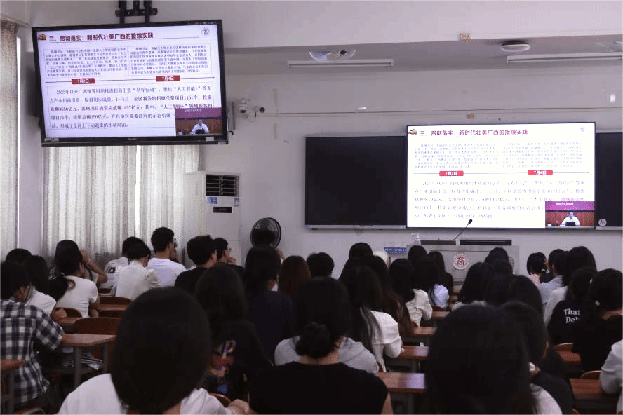 宣讲报告会站位高远、主题鲜明、内容丰富、讲解深入浅出。宣讲报告会结束后,同学们表示,将牢记嘱托、感恩奋进,努力夯实专业基础,把个人奋斗融入新时代壮美广西建设中,争当助力广西高质量发展的生力军。