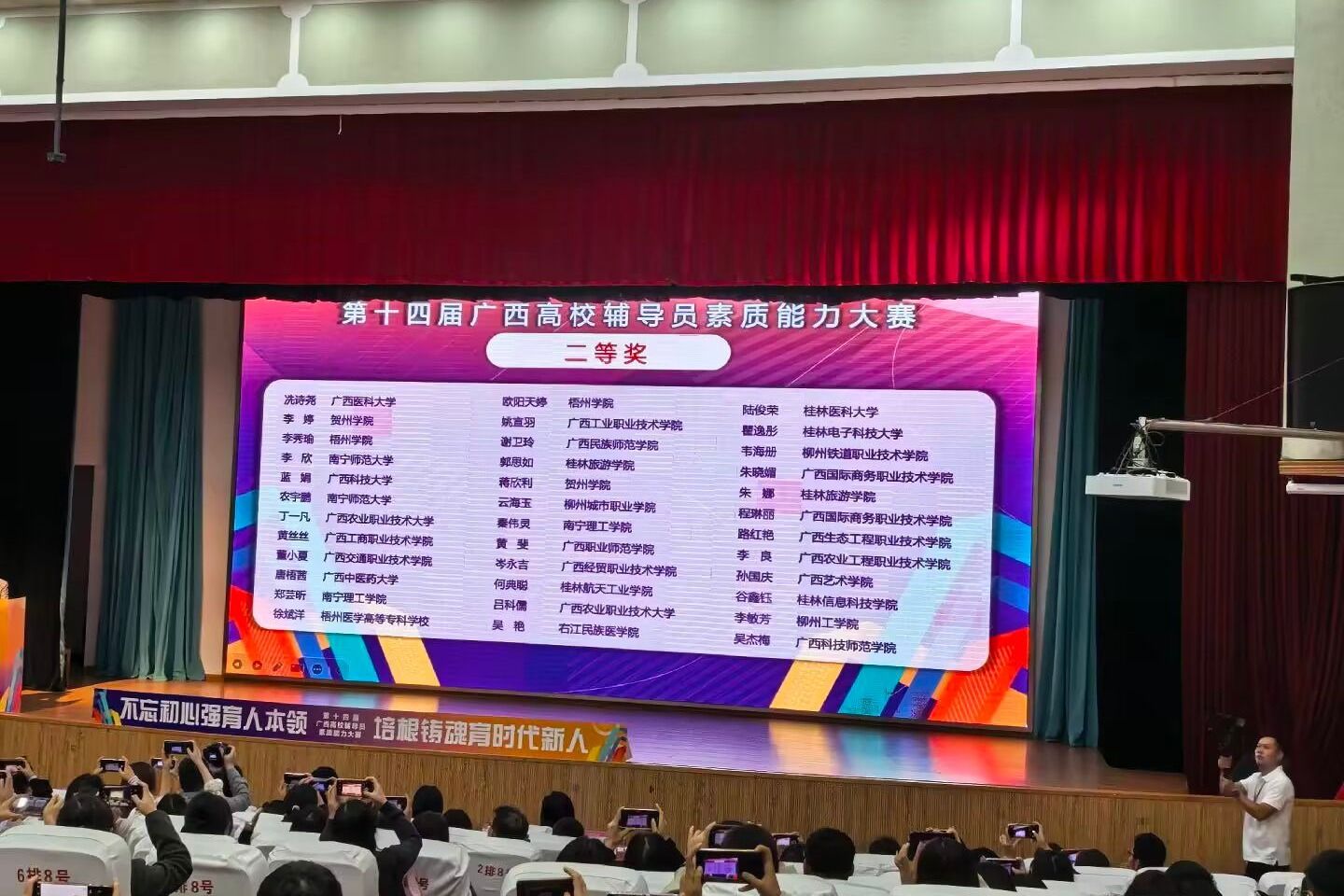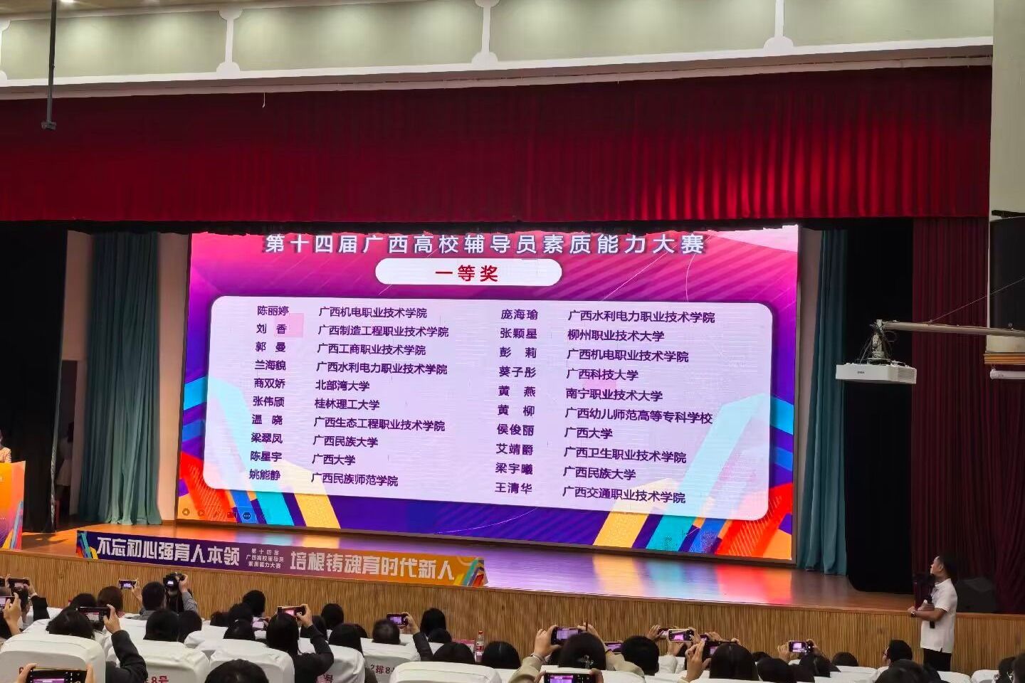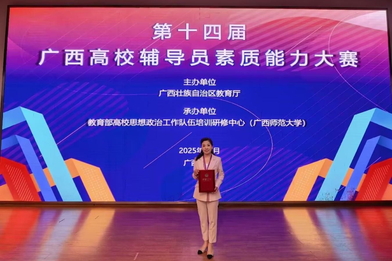 2025年10月29日至31日,由广西壮族自治区教育厅主办、教育部高校思想政治工作队伍培训研修中心(广西师范大学)承办的第十四届广西高校辅导员素质能力大赛(简称“大赛”)在广西桂林圆满落下帷幕,来自全区高校的113名参赛选手同台竞技。经过激烈角逐,pp电子参赛选手——经贸与康旅学院郭曼老师荣获一等奖、会计学院黄丝丝老师荣获二等奖。