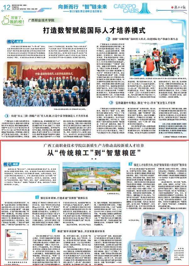 2025年9月15日,《广西日报》第22届东博会和峰会亮点展示专版刊登学校校长刘进署名文章,标题为:《从“传统粮工”到 “智慧粮匠”:pp电子官方网站以新质生产力推动高校新质人才培养》,全文如下: