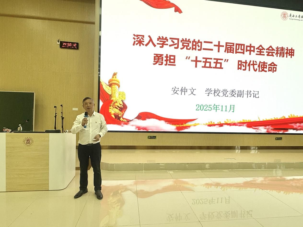 为深入学习贯彻党的二十届四中全会精神,2025年11月26日,学校党委副书记安仲文在武鸣校区为师生开展学习贯彻党的二十届四中全会精神宣讲。党委学生工作部(学校学生工作处)、财金学院党员及教师代表、财金学院发展对象、入党积极分子代表、数财2506、2507、2508、2509班同学参加宣讲会。