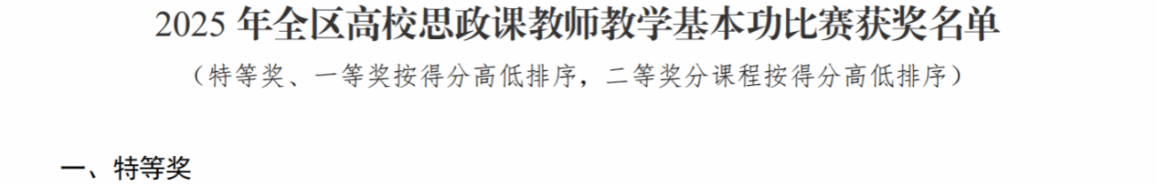 据悉,2025年全区高校思政课教师教学基本功比赛自今年8月份启动以来,全区各高校共推荐249名教师参赛。经初赛、决赛,高职高专组3名教师获得特等奖,10名教师获得一等奖,36名教师获得二等奖。