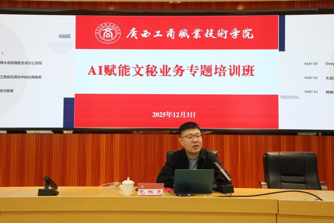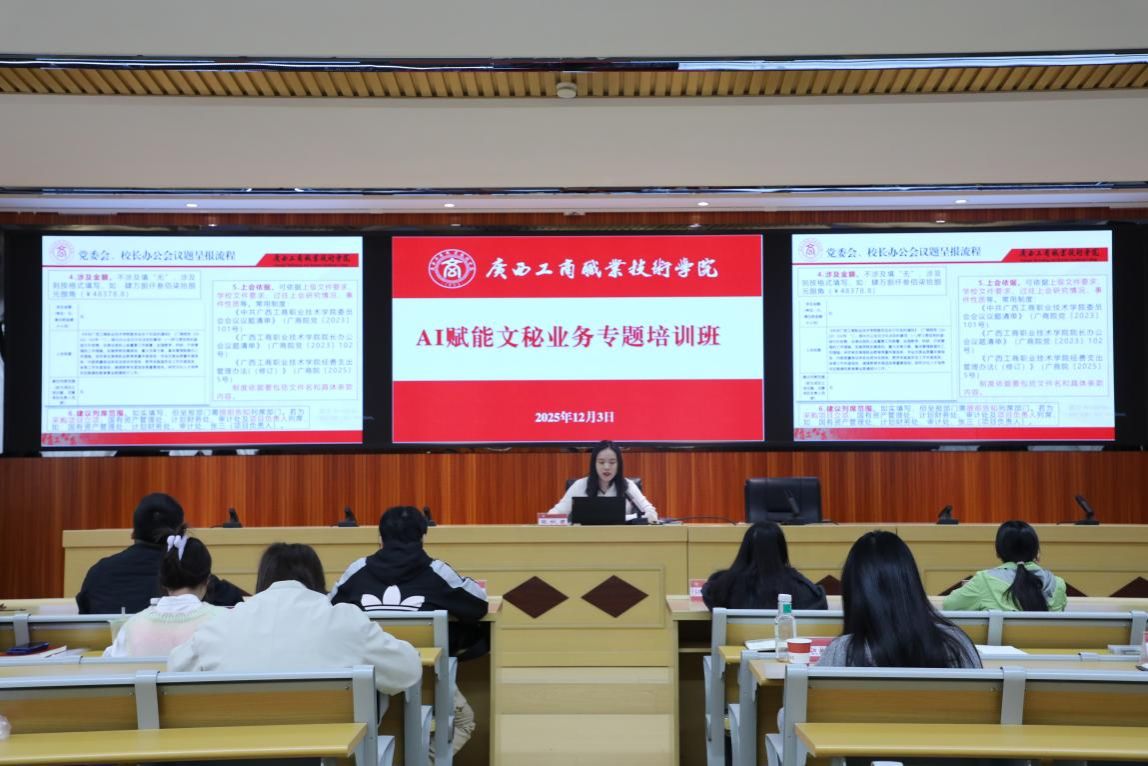 为进一步加强办文管理、规范办文行为,深入落实人工智能赋能学校高质量发展行动计划,提升办文质效,2025年12月3日上午,学校在鹏飞校区教学楼2145会议室举办2025年AI赋能文秘业务专题培训班。本次培训特邀桂林电子科技大学计算机与信息安全学院包旭光教授来校授课。各部门、各单位OA秘书、2024年以来新入职教职工以及有意愿了解文秘业务的教职工参加培训。培训由党委办公室(学院办公室)副主任、督查室主任张秋君主持。