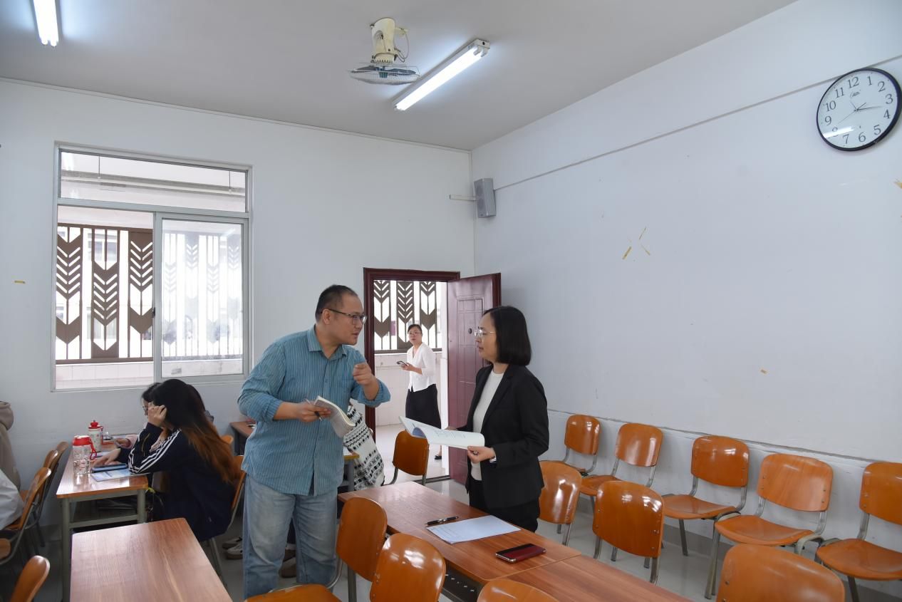 课后,学校党委副书记、纪委书记韦云凤与授课教师交流