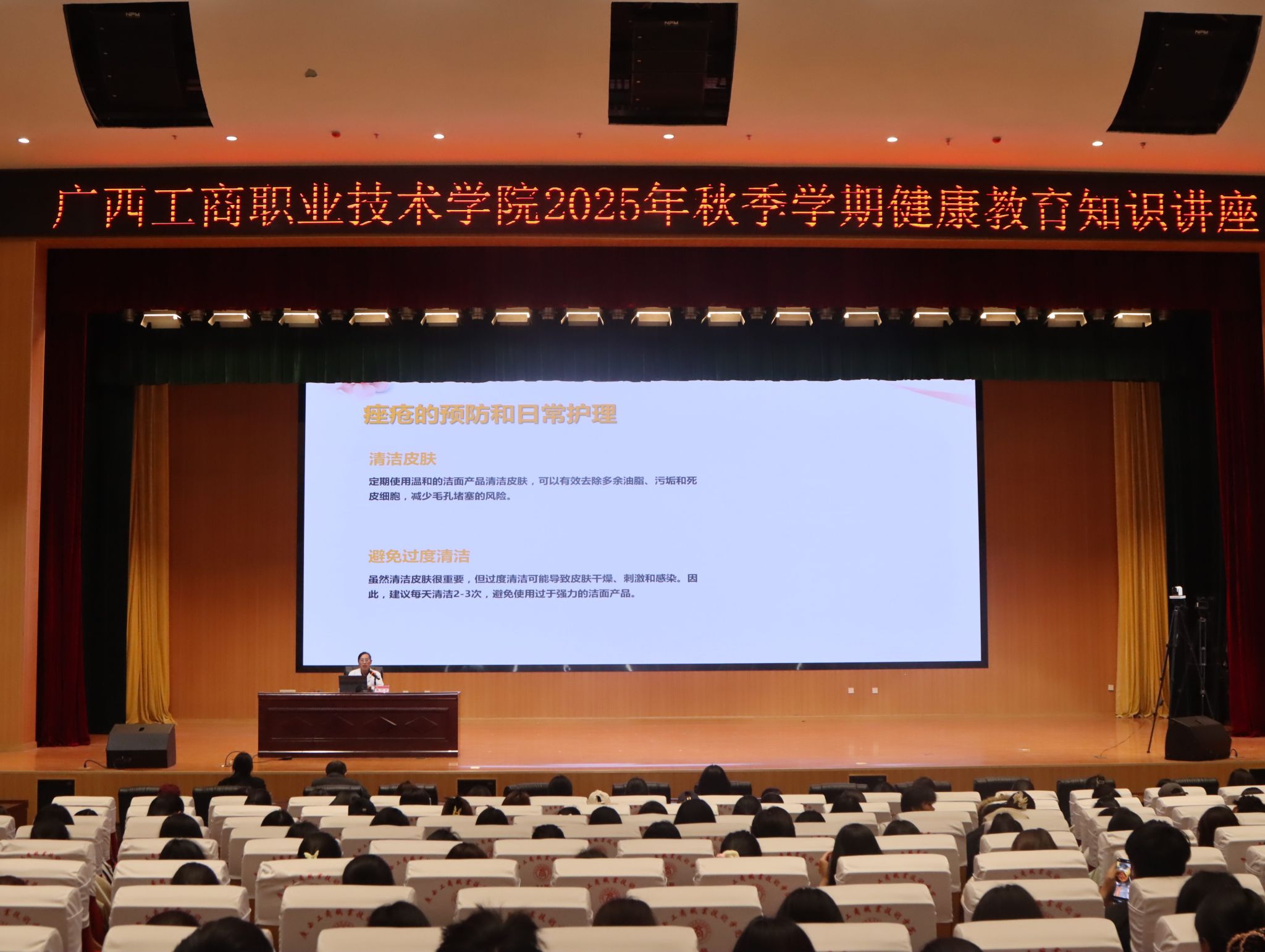 为实施健康中国战略,强化学生健康素养培育,引导师生树立科学健康观念,12月16日,pp电子在武鸣校区学术活动中心开展2025年秋季学期健康教育知识讲座。本次讲座特邀南宁市武鸣区妇幼保健院皮肤科主任黄丽芳、产科副主任医师覃柳芳授课,财金学院、粮油与管理学院、经贸与康旅学院、会计学院师生代表参加了此次讲座。