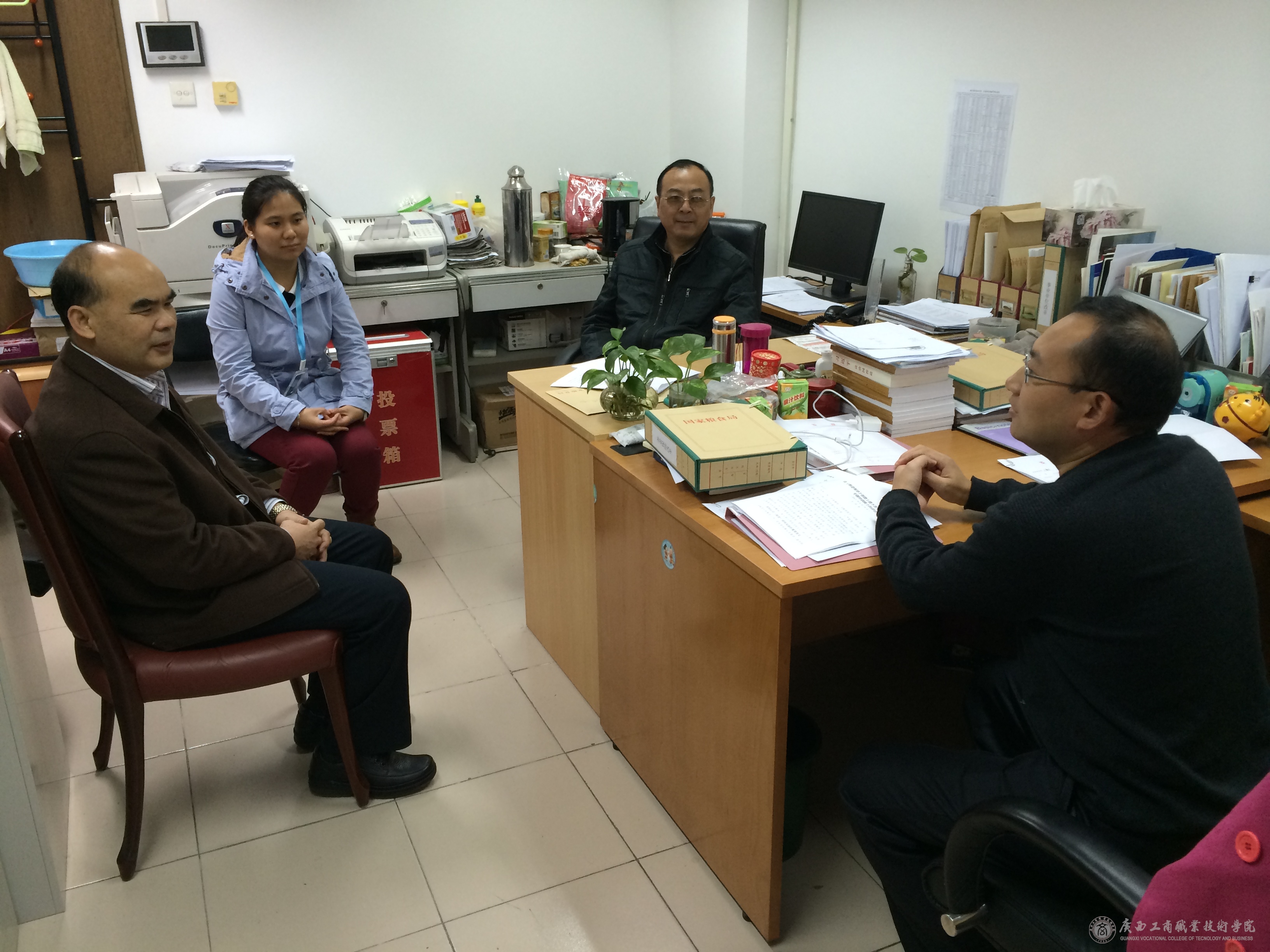 11月9日上午,学院党委书记覃武云与党委副书记、纪委书记蒙启成、党委组织部负责人一行3人前往国家粮食局看望我院在国家粮食局人事司挂职的干部赵婷老师。国家粮食局人事司司长陈军生、人事处处长林明亮、人才工作处处长李寅铨等领导热情地接待了覃武云书记一行,并进行了座谈交流。