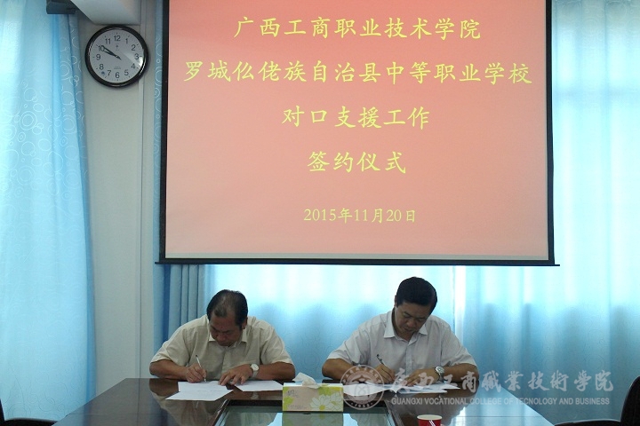 2015年11月20日上午,罗城仫佬族自治县中等职业学校罗智校长一行四人到访我院,就与我院签订对口支援工作协议事宜进行了研讨并签订了对口支援协议,明确了今后双方开展对口支援工作的方向和任务。