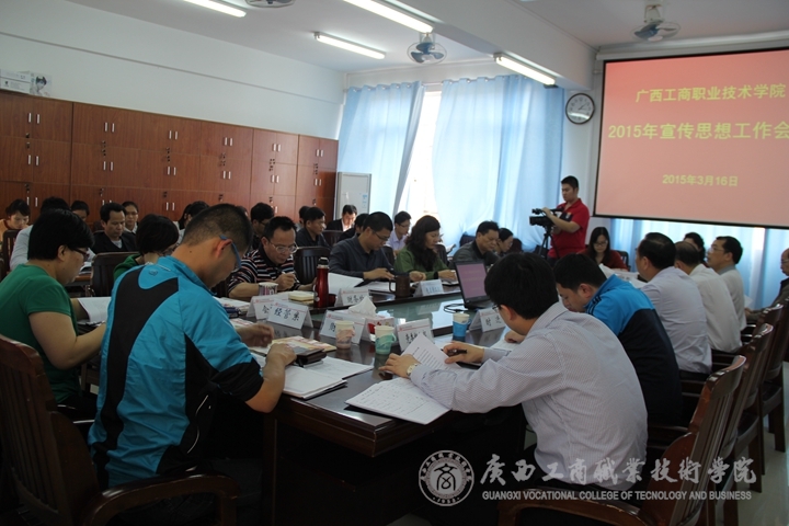 2015年3月16日下午,我院在校本部教学楼2109会议室召开2015年宣传思想工作会议,学院党委书记覃武云,党委副书记、纪委书记蒙启成出席会议并作重要讲话,各部门、各单位分管宣传工作的领导与宣传员参加会议。会议由学院党委宣传部部长孙德江主持。