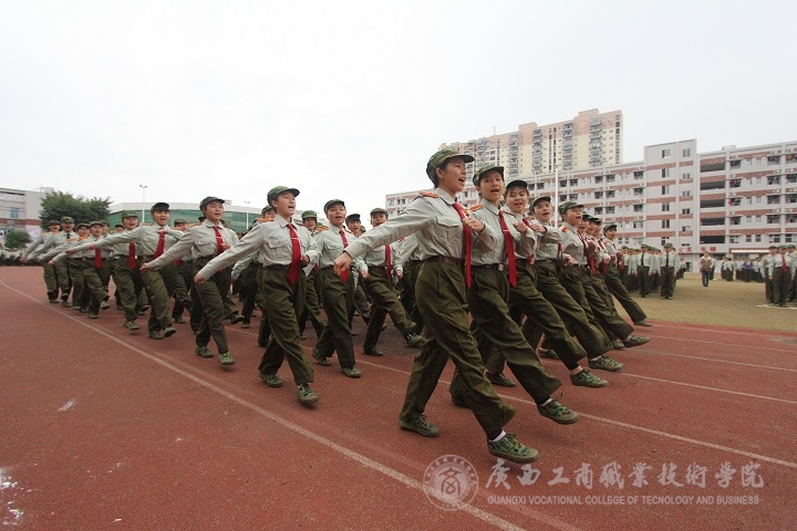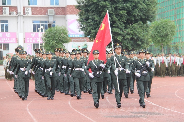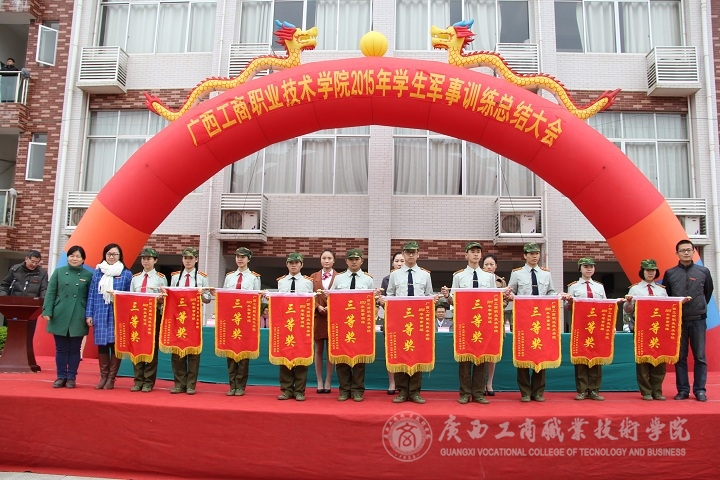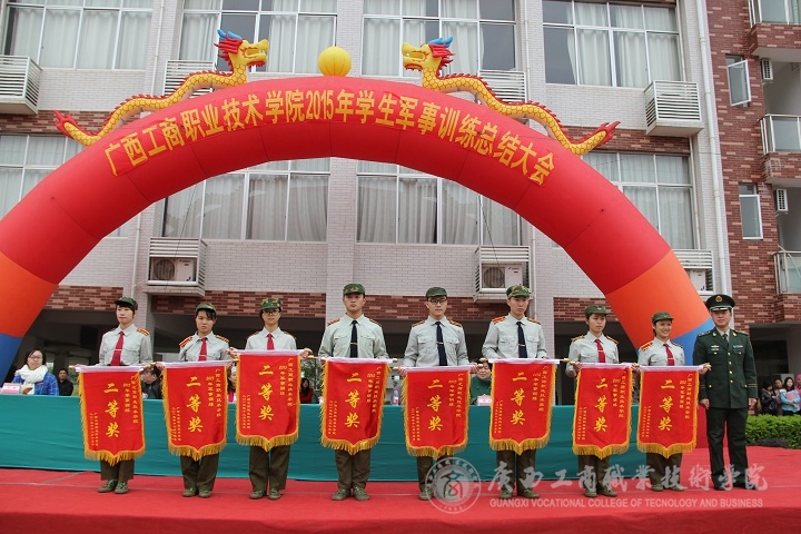 列队检阅完毕,武警广西总队直属支队曾又群副大队长宣布军训评选名单。学院党委书记覃武云,武警广西总队直属支队政治处副主任杨和奎以及各系部主任分别为军训获奖班级颁发锦旗。紧接着教官向全体师生展示了列队、擒拿格斗中的倒功和军体拳等表演。动作整齐,雄姿英发,军体拳声声有力,摔擒表演更是博得满场喝彩。