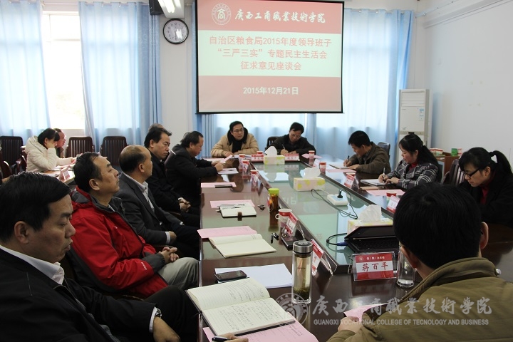 2015年12月21日下午3时,自治区粮食局机关党委负责同志冼一紫等一行三人前来我院组织召开“自治区粮食局领导班子‘三严三实’专题民主生活会征求意见座谈会”。我院领导班子全体成员,各党政教辅部门负责人、党支部负责人、各系党支部负责人参与了本次座谈会。