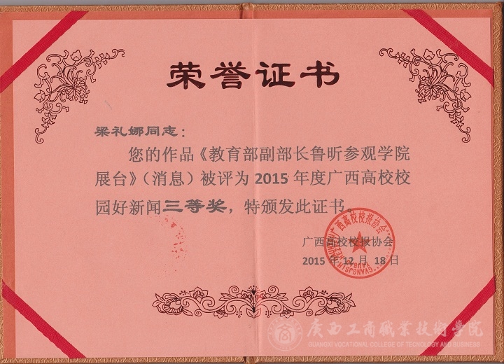 我院官网荣获“最佳新闻网站”三等奖;我院官网《挂职干部专题》荣获“最佳新闻网站栏目”三等奖;我院学生梁礼娜《教育部副部长鲁昕参观学院我院展台》荣获“校园好新闻”三等奖。