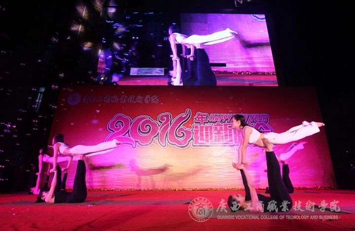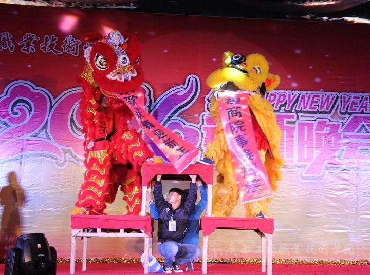 这次晚会开场首幕的是具有中国传统文化特色的舞狮表演,覃武云书记为狮子现场“点睛”成为全场焦点,并为我院2016年许下“风调雨顺”的祝语,随着主持人对各位来宾的介绍结束,就开始了如火如荼的精彩演出,舞蹈、走秀、唱歌、哑剧、瑜伽、武术这些展示无一不激动人心。其中,杨柳老师演唱的《红土乡》,婉转而又不失气魄,唱出了这首歌深沉的情感;一场《人生》的舞台剧,每一个场景的切换,都深刻突出了这场话剧的主题;一首《好好说再见》,演绎出了精彩绝伦的青春之歌;一支《雨中花》的舞蹈,用灵活而柔韧的四肢,展现出了雨中的感情和意境;而优雅的舞姿后面的节目,是大伙十分期待的重头戏,武警总队直属支队刚硬的擒拿武术表演,尽显男儿本色;表演的最后,由学院大学生艺术团以一支《see you again》,动感十足、激情似火的舞蹈结束了本场晚会。