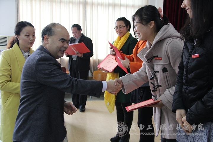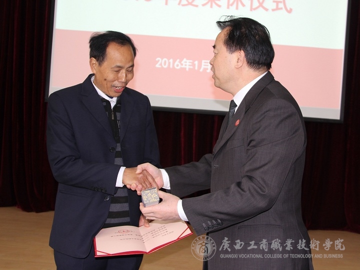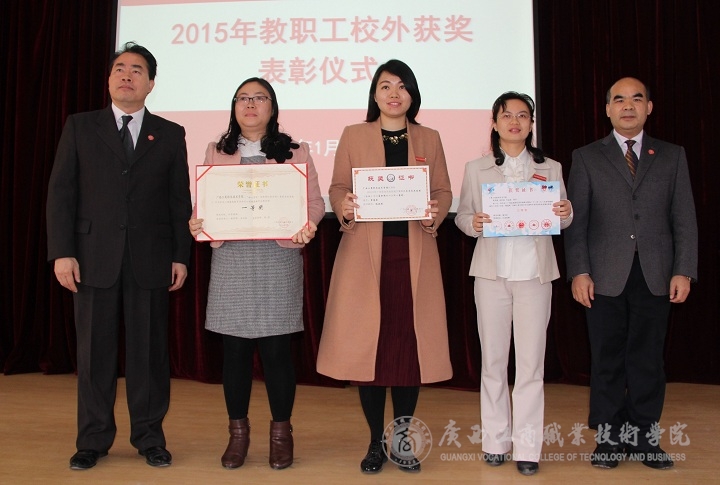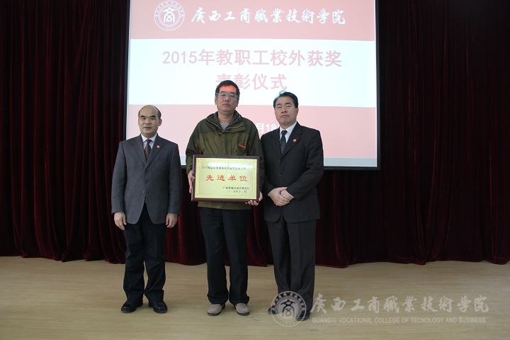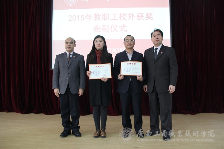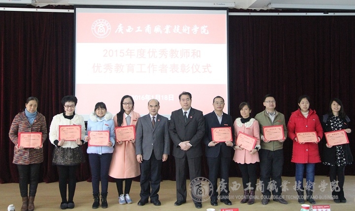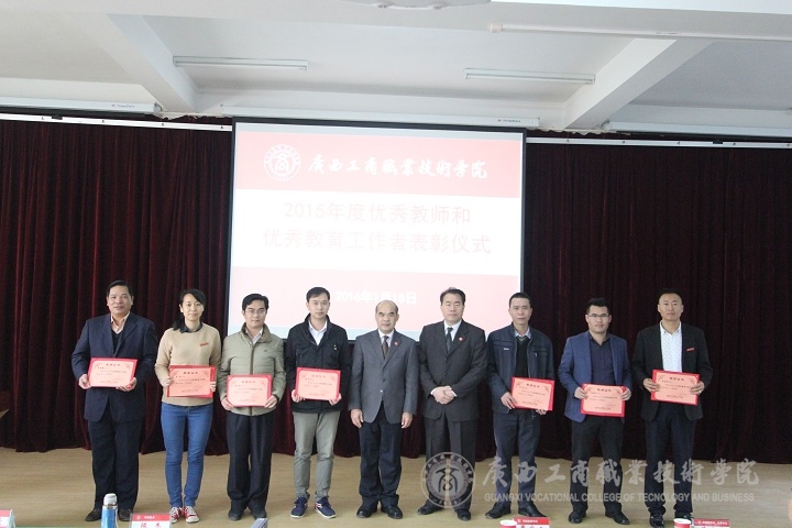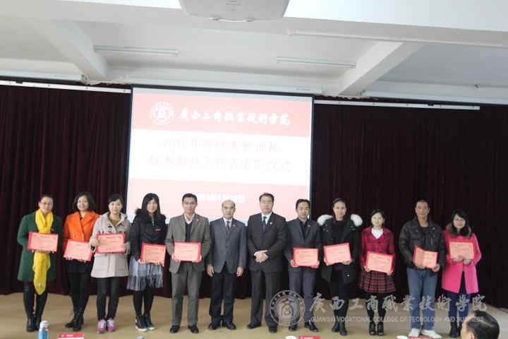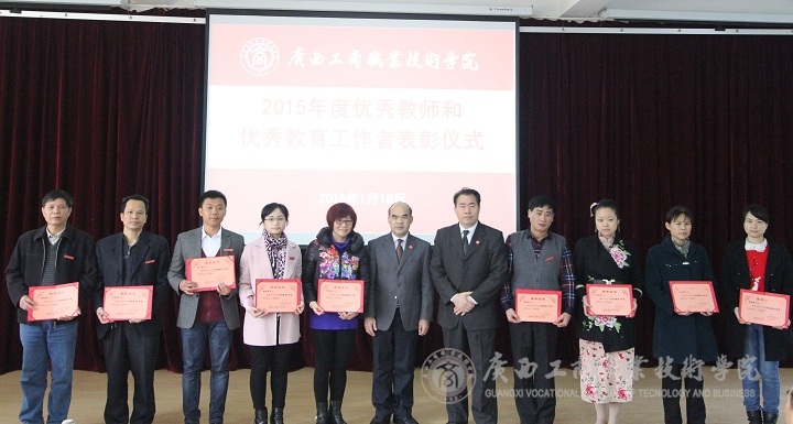 随后,由学院副院长李仕钦作2015年度优秀教师及工作者表彰决定报告。学院党委书记覃武云和学院院长为受表彰的教师及教育工作者颁发证书。