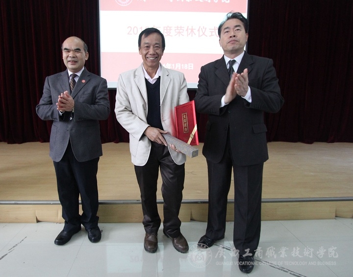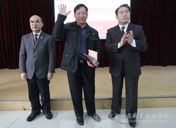 2015年度荣休仪式由党委副书记蒙启成主持。仪式正式开始前,与会人员集体观看了由学院党委宣传部新闻中心制作的7位退休教师的荣休榜短片,回顾了老教师们的光辉岁月。学院党委书记覃武云和学院院长陈杰为退休教职工颁发了证书以及退休纪念品,并合影留念。接着,陈杰院长发言讲话,他向大家说明了荣休仪式举办的意义,介绍了2015年度退休教师在我院的入职及工作情况,并向老教师们为学院默默无闻、孜孜不倦的付出表示衷心的感谢。