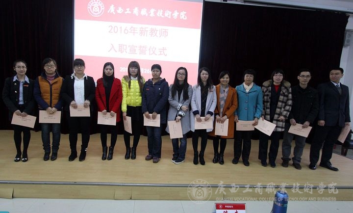 2016年2月26日上午,学院在校本部教学楼2145报告厅举行2016年春季学期新教师入职宣誓仪式,学院领导班子成员以及全体教职工参加了仪式,由学院党委副书记蒙启成主持仪式。