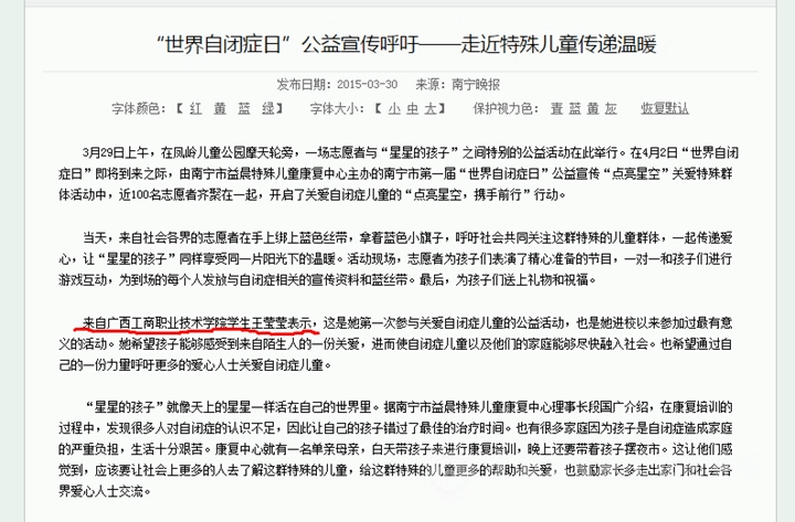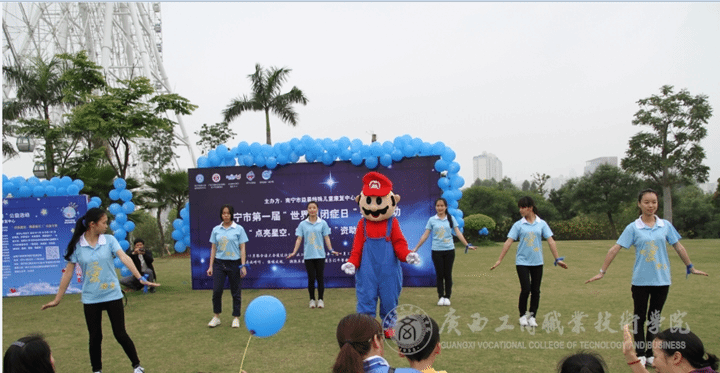 2015年3月29日,由南宁市益晨特殊儿童康复中心主办南宁市民政局与南宁市残疾人联合会承办的“点亮星空,携手前行!”公益计划——南宁市第一届“世界自闭症日”公益活动在南宁市凤岭儿童乐园举行,我院红十字会服务队作为协办方参加了本次活动。