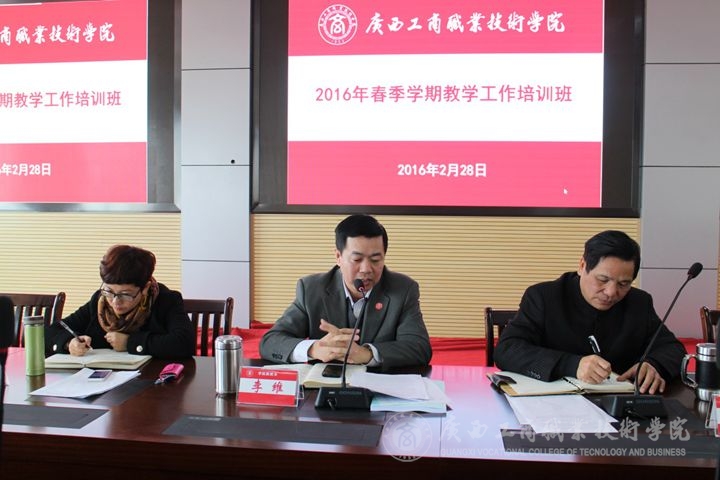 培训班首先由教务科研处韦胜强处长对2016年度教学、科研、招生工作进行了布置。韦处长主要从加强服务社会能力,突出教学中心地位,更加规范教学管理工作、突出人才培养改革创新,不断提升教学质量,进一步优化教师队伍结构,加强校企合作,深化产教深度融合,加大科研工作力度等方面对2016年教学工作目标与任务进行了阐述。