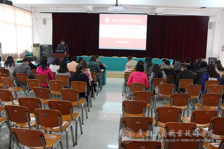 2016年2月28日15:00,我院在校本部教学楼2145报告厅举办2015—2016学年寒假学生工作培训班。学院党委副书记蒙启成、各系党总支书记、系学工副主任、就业副主任、全体辅导员及学工处全体人员参加了培训,由党委学工部副部长张居设主持。