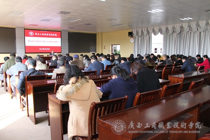 2016年2月29日下午15:00,我院在校本部2119视频会议室举行领导班子和领导干部2015年度考核测评会。自治区党委干部处副处长邓红专、自治区高校工委组织部主任科员罗建岚、学院覃武云书记、学院陈杰院长、学院蒙启成副书记、学院李仕钦副院长、学院李维副院长、学院副厅级调研员黄永蓬出席了本次会议,学院中层管理干部及正高职称教师参加了此次大会。会议由覃武云书记主持。