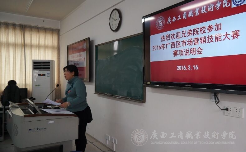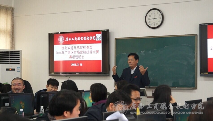 2016年3月16日14时, 2016年广西职业院校技能大赛高职组市场营销技能赛项说明会在我院本部教学楼2511教室举行。学院教务科研处处长韦胜强教授、经管系谭波主任、高职研究所副所长叶桂中教授和来自全区大部分参赛院校领队和指导教师、营销技能竞赛技术支持单位代表共40多人参加了赛项说明会。