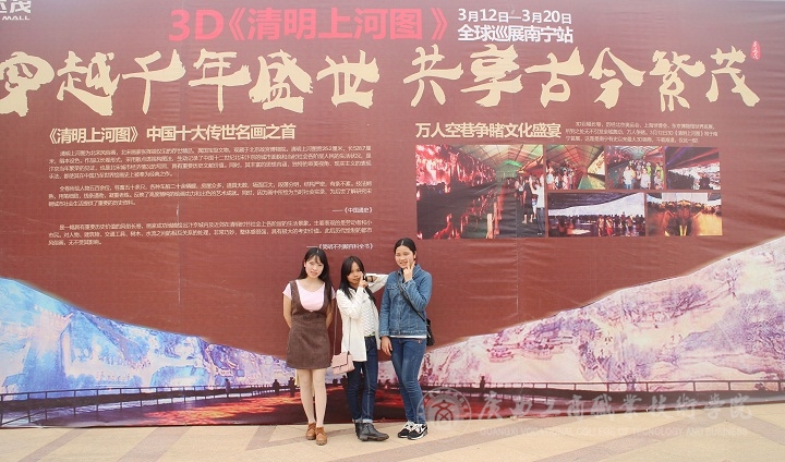 2016年3月20日上午,为了感受中国古典艺术气息的熏陶,为了丰富同学们的课余生活,我院新闻中心的同学们自发组织穿越大半个南宁去到了南宁市五象新区万达茂观看“3D版清明上河图”,让我们真真切切的感受到了中国国宝级名画、十大传世名画之首的《清明上河图》3D巨幅长卷所带来的震撼。