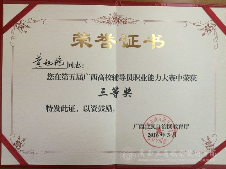 2016年3月21-23日,由自治区高校工委、自治区教育厅主办,广西高校辅导员培训和研修基地承办的第五届广西高校辅导员职业能力大赛在广西大学举办。来自全区60多所高校的88名辅导员参与大赛的角逐,在主题班会视频、基础知识测试、博文写作、案例分析、主题演讲等比赛环节中,我院黄旭艳老师凭借扎实的理论功底、过硬的专业技能和优秀的职业素养获得了三等奖,这也是pp电子目前在广西高校辅导员职业能力大赛中获得的最好成绩。