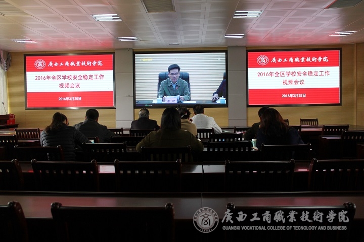 2016年3月25日下午15:00,我院领导和部门代表在校本部2119视频会议室参加由自治区教育厅秦斌厅长做重要讲话的全区学校安全稳定工作视频会议,学院院长陈杰、副院长李仕钦、相关部门代表及各系分管学生工作的党总支副书记出席了本次视频会议。