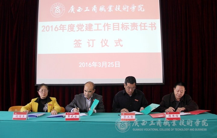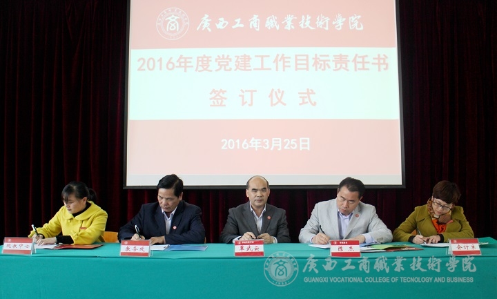 在会上,签订了学院《2016年度党建工作目标责任书》和《2016年党风廉政建设责任书》。首先是各部门负责人与学院党委书记覃武云签订《2016年度党建工作目标责任书》。随后,各部门负责人再次与学院党委书记覃武云,学院党委副书记、院长陈杰签订《2016年党风廉政建设责任书》。