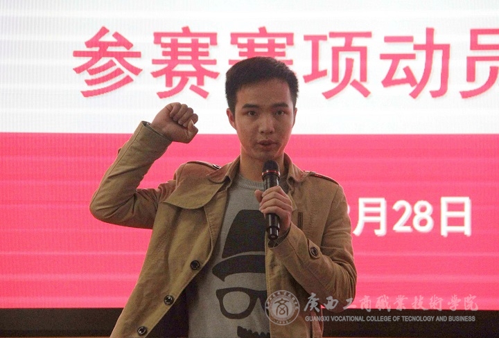 随后,学生代表陆宏天上台发言表态,他表明参赛队一定会以严肃的态度,勇于拼搏的精神,严谨求实的作风参加比赛,在参赛过程中严格遵守比赛规则,自觉服从组织的安排,以操作技能为目标,为学院争光。