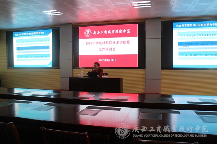 为进一步加强师资队伍建设,规范pp电子社会科学研究及评奖申报工作程序,加强pp电子哲学社会科学项目暨广西第十四次社会科学优秀成果奖申报组织工作,全面提高pp电子教师的教学、科研学术能力以及科研成果转化工作水平,2016年4月12日下午15:00,我院在校本部2119会议室举办了“社科联学术讲座暨工作研讨会”,学院社科联特别邀请了自治区社科联党组成员、副主席曹平研究员为我院教师作了题为《社会科学评奖与社会科学研究》的专题讲座。讲座由我院社科联主席、学院党委副书记兼纪委书记蒙启成主持,会计系、经管系、财信系、社科部、公共部、学工部等六个教学系部及相关行政部门的近100名教师聆听了讲座。