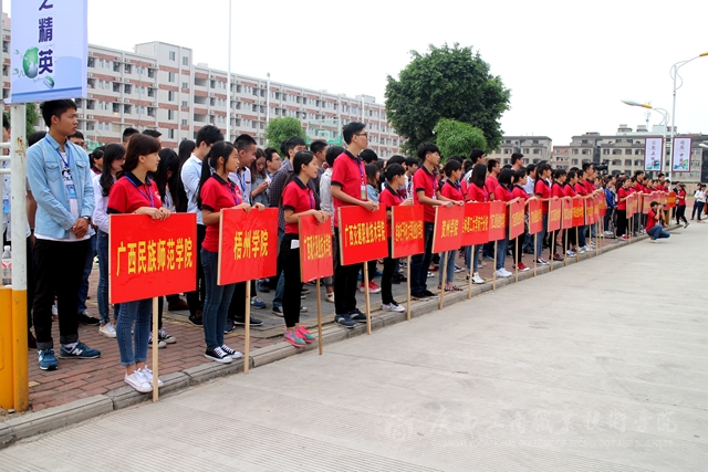 4月25日上午八点,迎着和煦的春风,2015年广西职业院校技能大赛高职组市场营销技能赛项启动仪式在pp电子官方网站本部LED大屏幕前隆重举行。赛项裁判组成员、参赛院校领队、指导教师,营销竞赛承办院校领导、营销技能竞赛技术支持单位代表和参赛选手共100多人参加了启动仪式。本次赛项由自治区教育厅主办,我院承办。