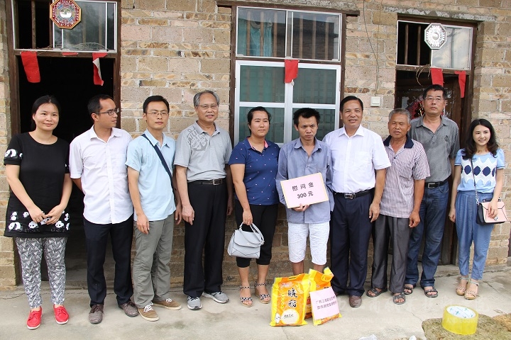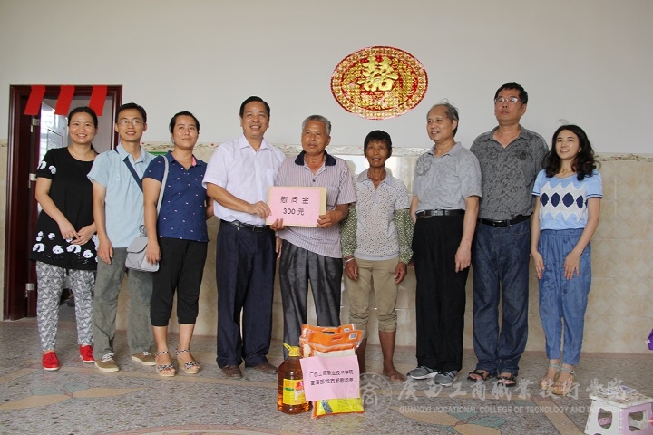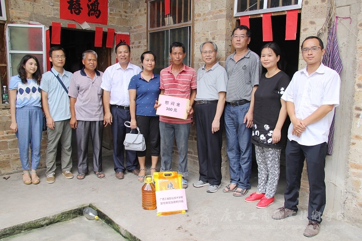 2016年7月8日,学院黄永蓬副厅级调研员率党委宣传部部长韦胜强、后勤管理处处长付光、宣传部党员教师等一行五人前往陆川县看望驻四乐村第一书记罗北战同志,走访慰问该村老党员、困难党员、困难群众,并为当地小学困难学子捐献学习用品。