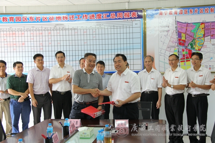 据悉,广商院入住南宁教育园区建设项目前期工作进展顺利。5月5日获得自治区教育厅《南宁教育园区学校入院建议书》,6月23日,南宁教育园区东片区指挥部已确定我院新校区初步选址方案。经学院与武鸣区人民政府商议,于2016年7月6日正式签订《入驻南宁教育园区武鸣东片区框架协议书》,至此,广商院开启了在武鸣新校区建校办学的新时代。
