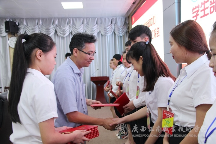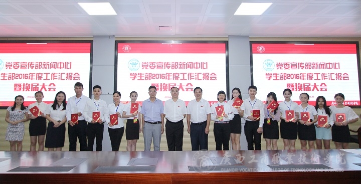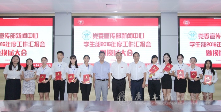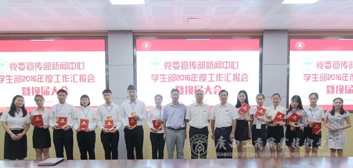 会议最后,由蒙启成副书记为粟兰惠、梁礼娜、李蓉荣等新闻中心获得广商院2015-2016年“优秀记者”的同学颁发证书;韦胜强部长和林雯副部长分别为新闻中心获得广商院“新文化建设贡献突出者”、“防艾微电影贡献者”的同学颁发证书,韦胜强部长还现场为新闻中心14级全体成员颁发了聘书。