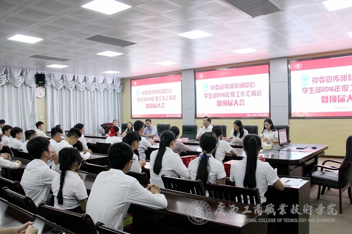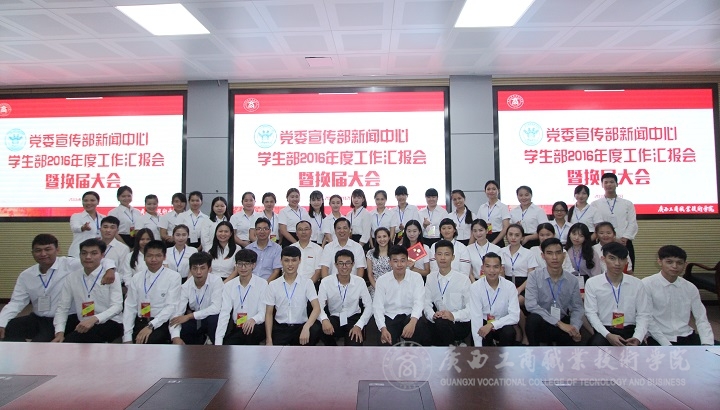 2016年7月12日下午五点,我院在校本部2119视频会议室举办“新闻中心学生部2016年度工作汇报会暨换届大会。”学院党委副书记蒙启成、党委宣传部部长韦胜强、现教中心主任、党委宣传部副部长林雯、新闻中心指导老师、新闻中心学生部全体成员参加了本次大会。会议由新闻中心播主部宋珮瑶主持。