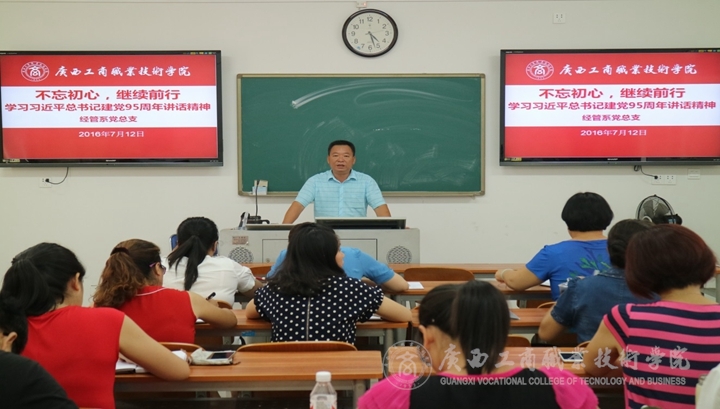 与此同时,宣传部与现教中心党支部、教务科研处、财务处、会计系、经管系、财信系、公共基础部分别在广商院2223、学术厅、2327、2224、2318、2219等教室和办公室对习总书记的“七一”重要讲话进行学习探讨。其中,在2223教室,韦胜强部长围绕八个“不忘初心、继续前进”与与会党员同志进行交流学习。他提出,习近平总书记重要讲话中谈及青年并给予了厚望,表明了党对我国青年的关心和关注,这鼓舞着我院青年教师的成长。在2219教室,公共基础部张居设主任围绕“立足岗位,开拓进取”,就“三十个要点”为大家阐述中国共产党开天辟地的大事件,鼓舞在场的党员教师们奋发前行。