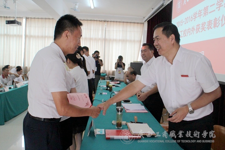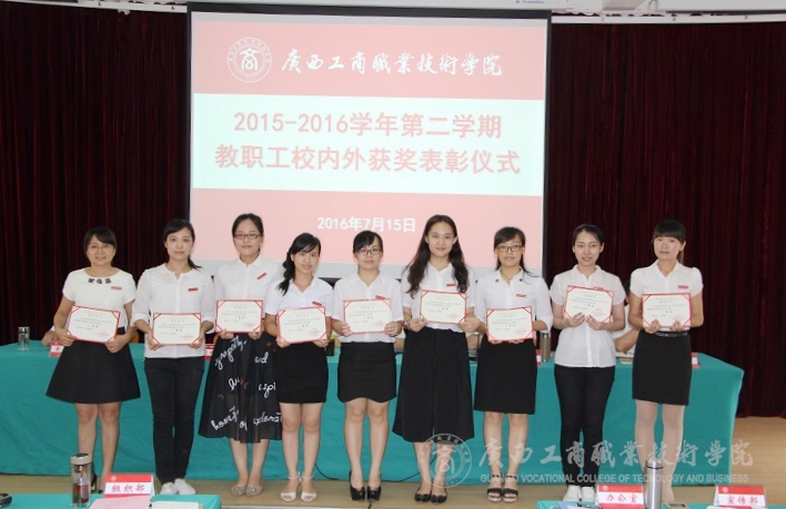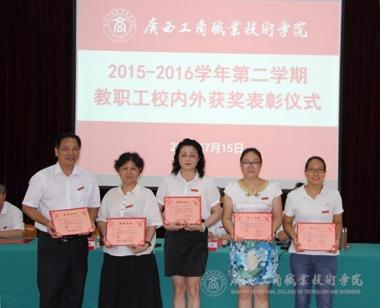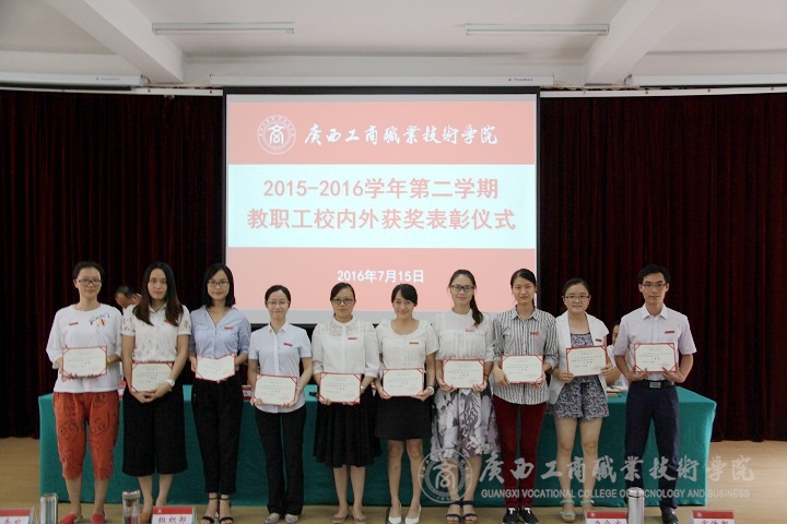 2016年7月15日下午,我院于校本部教学楼2145报告厅隆重举行2015—2016学年第二学期教职工校内外获奖表彰仪式。学院党委书记覃武云、院长、党委副书记陈杰、党委副书记、纪委书记蒙启成、副院长李维、副厅级调研员黄永蓬以及各部门领导、教职工出席了本次会议。会议由蒙启成副书记主持。