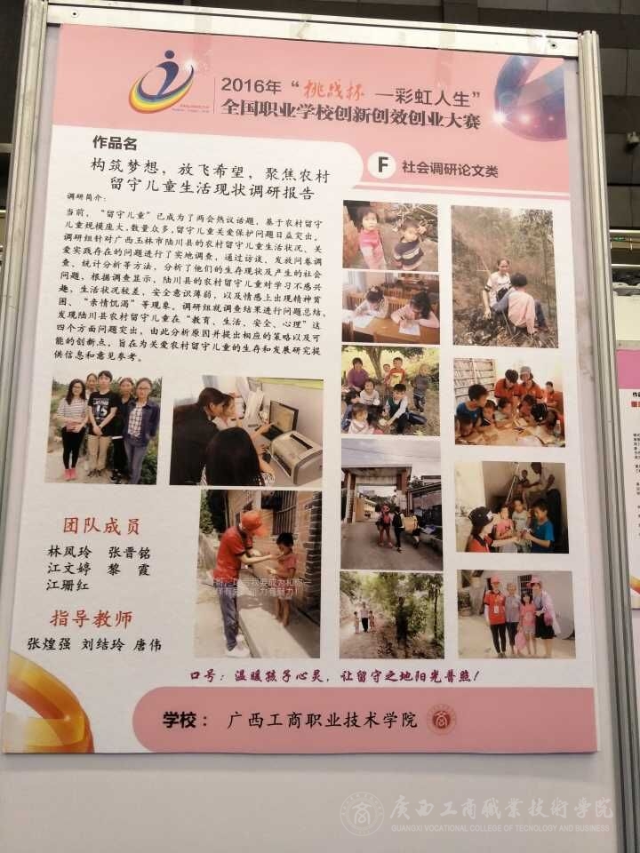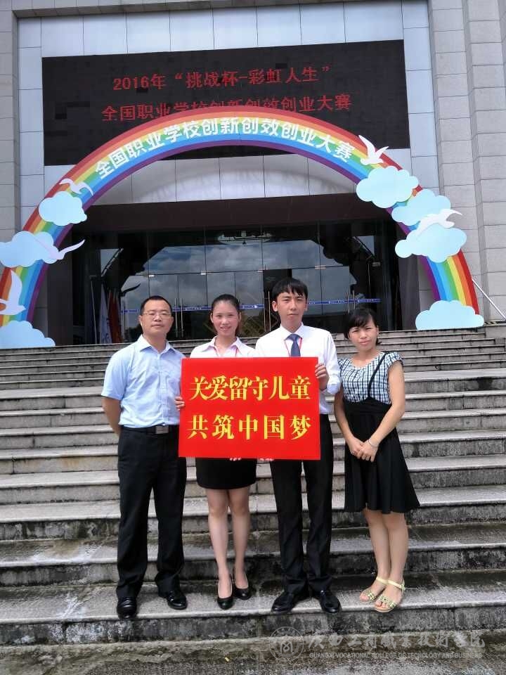 由团中央、教育部、人社部、中国科协、全国学联、省政府共同主办,团省委、省教育厅、省人社厅、省科协、省学联、福州市政府、福建师范大学共同承办的2016年“挑战杯——彩虹人生”全国职业学校创新创效创业大赛总决赛于今年8月11-14日在福建福州隆重拉开帷幕。我院的参赛作品《构筑梦想,放飞希望,聚焦农村留守儿童生活现状调研报告——以广西玉林市陆川县为例》(指导教师:张煌强、刘结玲、唐伟)在全区初赛和全国复赛中脱颖而出,代表广西社会调研论文类进入了全国总决赛。8月10日,我院参赛代表队在学院团委副书记赵婷老师的带领下,前往福建福州参加今年的总决赛。