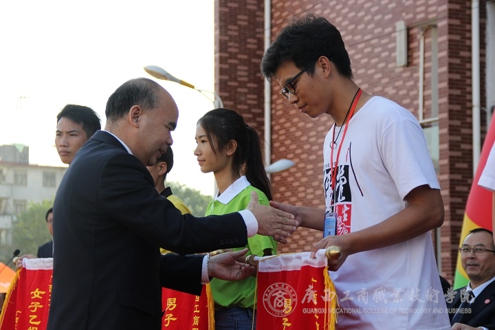 卢炳秋老师首先宣布获得奖项名次的团体,获得本次运动会“道德风尚奖”第一名是财信系,第二名是经管系。获得甲组男子第一名是的经管系,第二名是财信系;甲组女子第一名是财信系,第二名是会计系。乙组男子第一名是财信系,第二名是经管系;乙组女子第一名是会计系,第二名是经管系。党委书记覃武云、党委副书记纪委书记蒙启成、副院长李维、副院长陈宁春分别为获得各项比赛第一、二名的团体颁发了奖旗并合影留念。