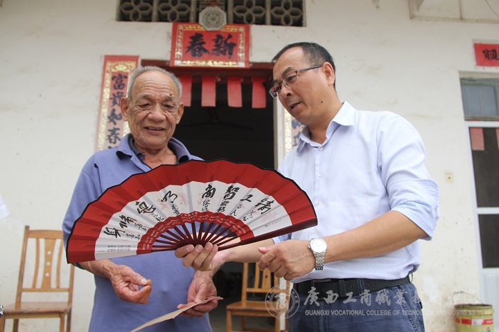 在走访慰问中,支部同志了解到:叶德海同志1973年加入中国共产党,拥有43年的党龄,是四乐村困难党员的代表;何惠同志1953年出生,是村里老党员代表,他们在四乐村党组织的建设中作了大量的工作。蒙启成副书记详细询问了老人的身体健康和家里生活情况,并握着老人的手嘱咐他们一定要保重身体。最后,支部书记孙德江同志代表学生工作部党支部为老党员送上了慰问金,学院党委副书记蒙启成同志赠送了广商院文化扇。
