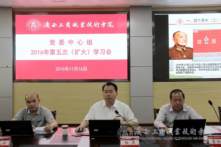 2016年11月16日下午,我院在校本部召开2016年第五次(扩大)学习会。学院党委书记覃武云、党委副书记、院长陈杰、党委副书记、纪委书记蒙启成、副院长李仕钦、副院长李维、学院副厅级调研员黄永蓬、副院长陈宁春出席会议。会议由覃武云书记主持。
