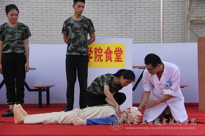 体验完毕后,广西民族医院医生陈检为现场师生讲解食物中毒、人工心肺复苏急救知识及急救时需注意的事项,突发事件处理方法的实践。陈检医生在同学们上去演练之时手把手教学,向同学们仔细的讲解动作要领,在台下的同学们也细心观看,跃跃欲试。