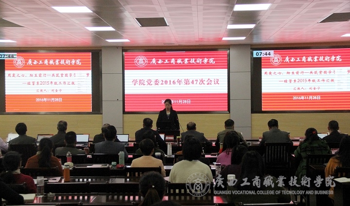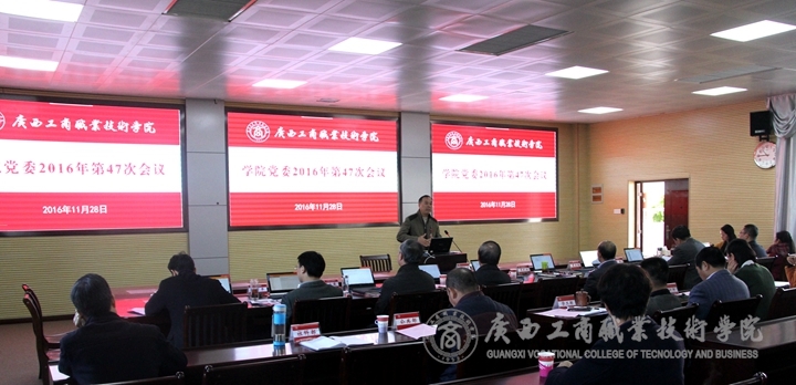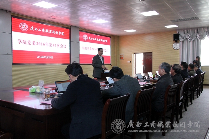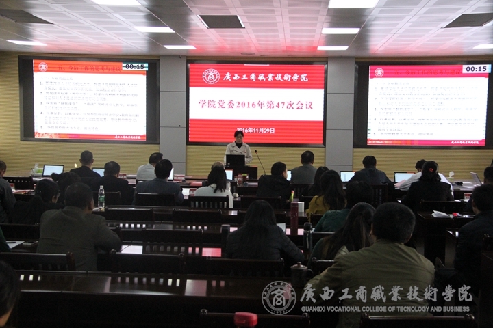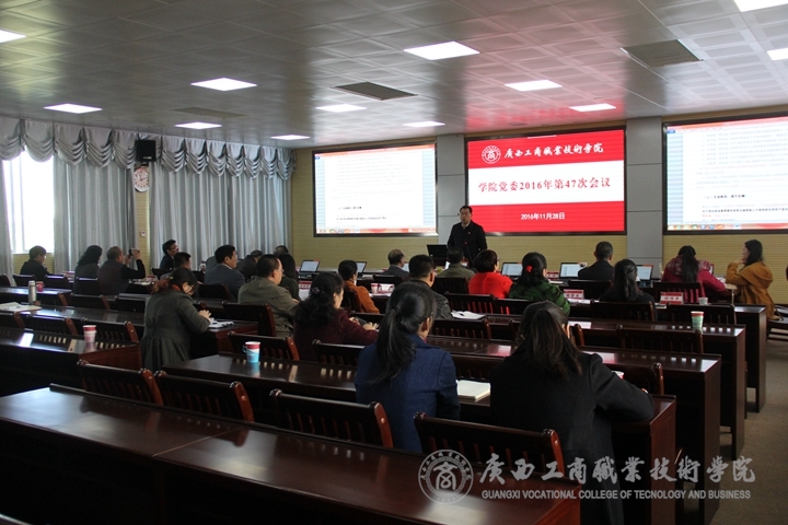 2016 年 11 月 28 日全天、29日下午,我院在校本部2119视频会议室召开第47次党委会,听取我院教改和教师专题汇报。学院党委书记覃武云、党委副书记、院长陈杰、党委副书记、纪委书记蒙启成、党委委员、副院长李仕钦、党委委员、副院长李维、学院副厅级调研员黄永蓬、党委委员、副院长陈宁春出席会议,蒋百平、覃超颖、林雯等三位党委委员共同参会。