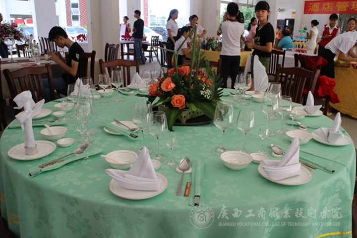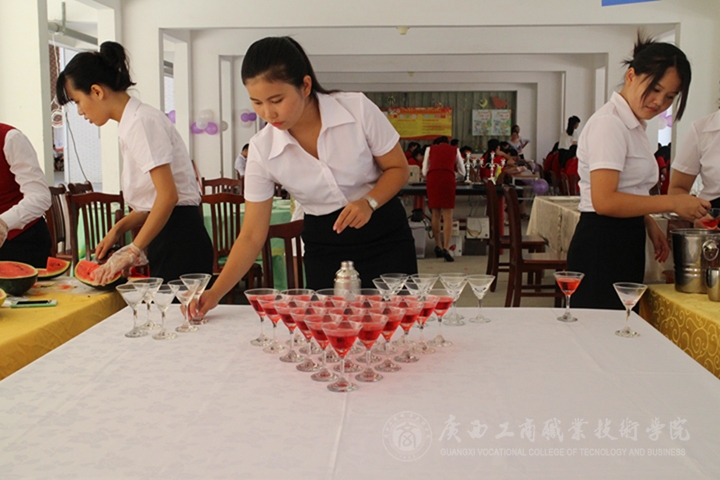 在酒店管理专业学生的西餐摆台、中餐摆台、餐巾花折叠、调酒表演等既展示出学生娴熟的专业技能,也体现学院严谨专业的教学。
