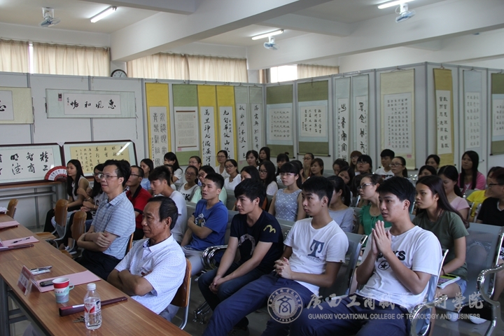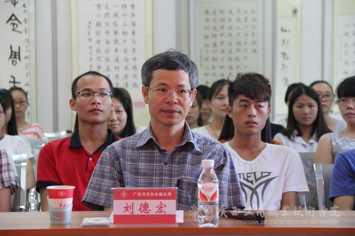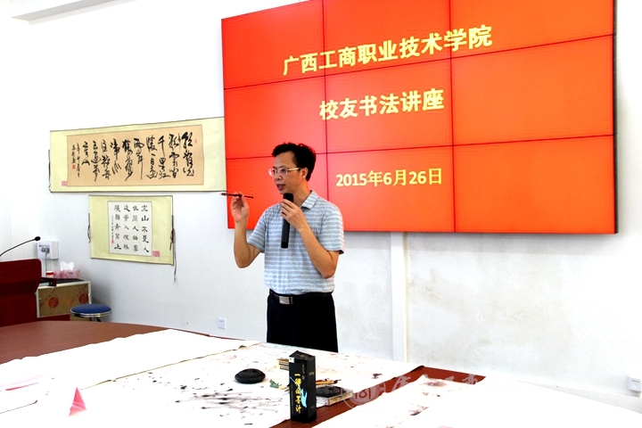 2015年6月26日下午,我院在校本部教学楼2514创业实训中心召开校庆日校友书法讲座。原财会792班校友、中国书法家协会理事、广西书法家协会常务副主席刘德宏,原计统821班校友,自治区粮食局人事处处长韦尚英,学院副院长李维,档案馆筹建办副主任韦小福,党(院)办副主任高洁,学院鸿轩书画协会的学生代表及13级学生代表参加了书法讲座。座谈会由李维副院长主持。