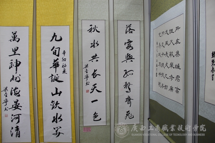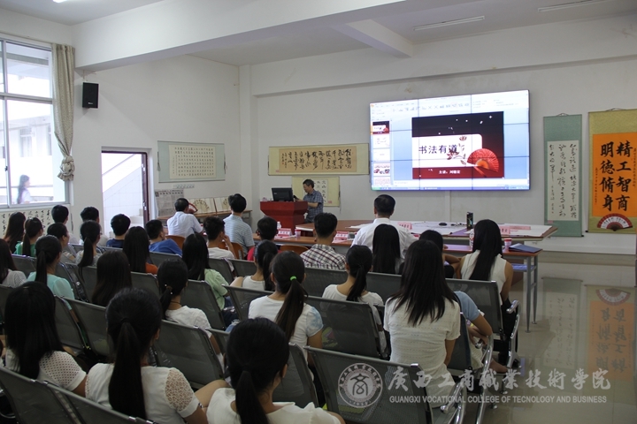 此次书法讲座会上,广西书法家协会常务副主席刘德宏上台给在场各位讲评了“书法有道”的概念。同大家观看了一些自己的书法作品并热情的与大家分享自己的创作心得以及自己在书法道路上的故事。接着自治区粮食局人事处处长韦尚英上台发表讲话,向大家讲起了往年自己参加的一些书法比赛,就如何提高同学们对书法的兴趣、书法基础要领、如何写好书法等问题做了详细的讲解并给同学们示范了一些字的点笔与勾勒。