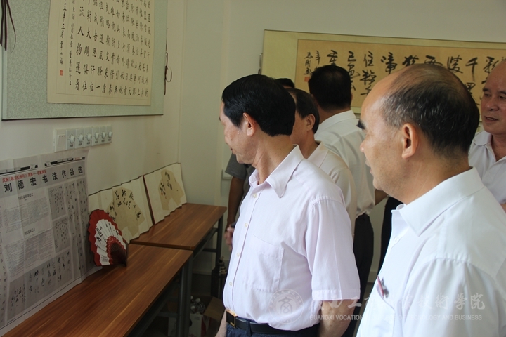 随后,学院领导陪同老领导一起观摩了陈列在展厅里校友和我院师生的一些优秀书法作品,与学生互动提问、交流。