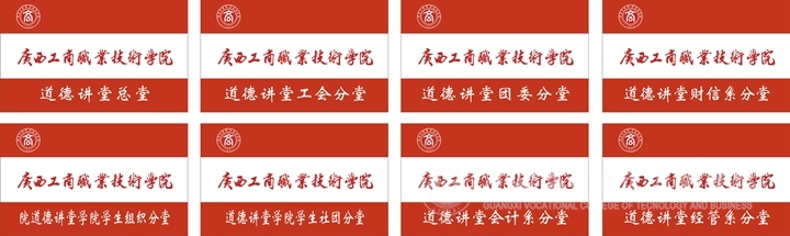 在道德讲堂硬件布置上,我院突出 “以德育商”元素,体现商院特色,设计了专门的“道德讲堂”统一LOGO标识、讲堂背景板、道德箴言挂板及纪念品。并为道德讲堂总堂、工会分堂、团委分堂、学院学生组织分堂、学院学生社团分堂和各系分堂制作了专门的“广商育人红”道德讲堂旗帜。